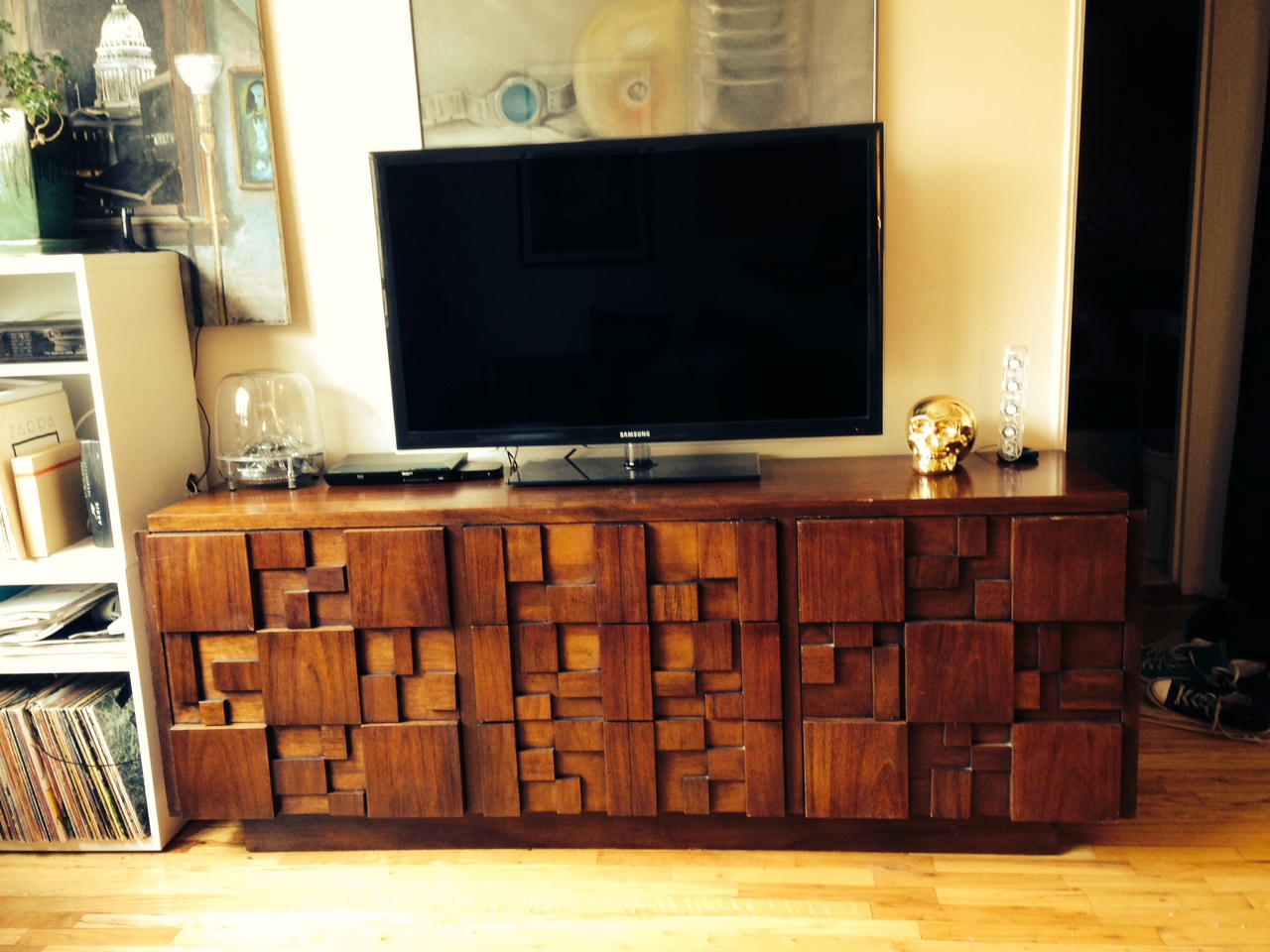 This brings me to the rug I want in our living room. This is Chenille Charade, in Persimmon, by Flor. It is more expensive than I want it to be, but it will be fabulous in the new living room. I first used Flor carpet tiles more than ten years ago in my Chicago Loft (where you will also see red). We already have a black leather Ikea sofa, which we will incorporate into the new home. We also have a beautiful Brutalist Credenza by Lane (inspired by Paul Evans) we recently purchased with wedding money.